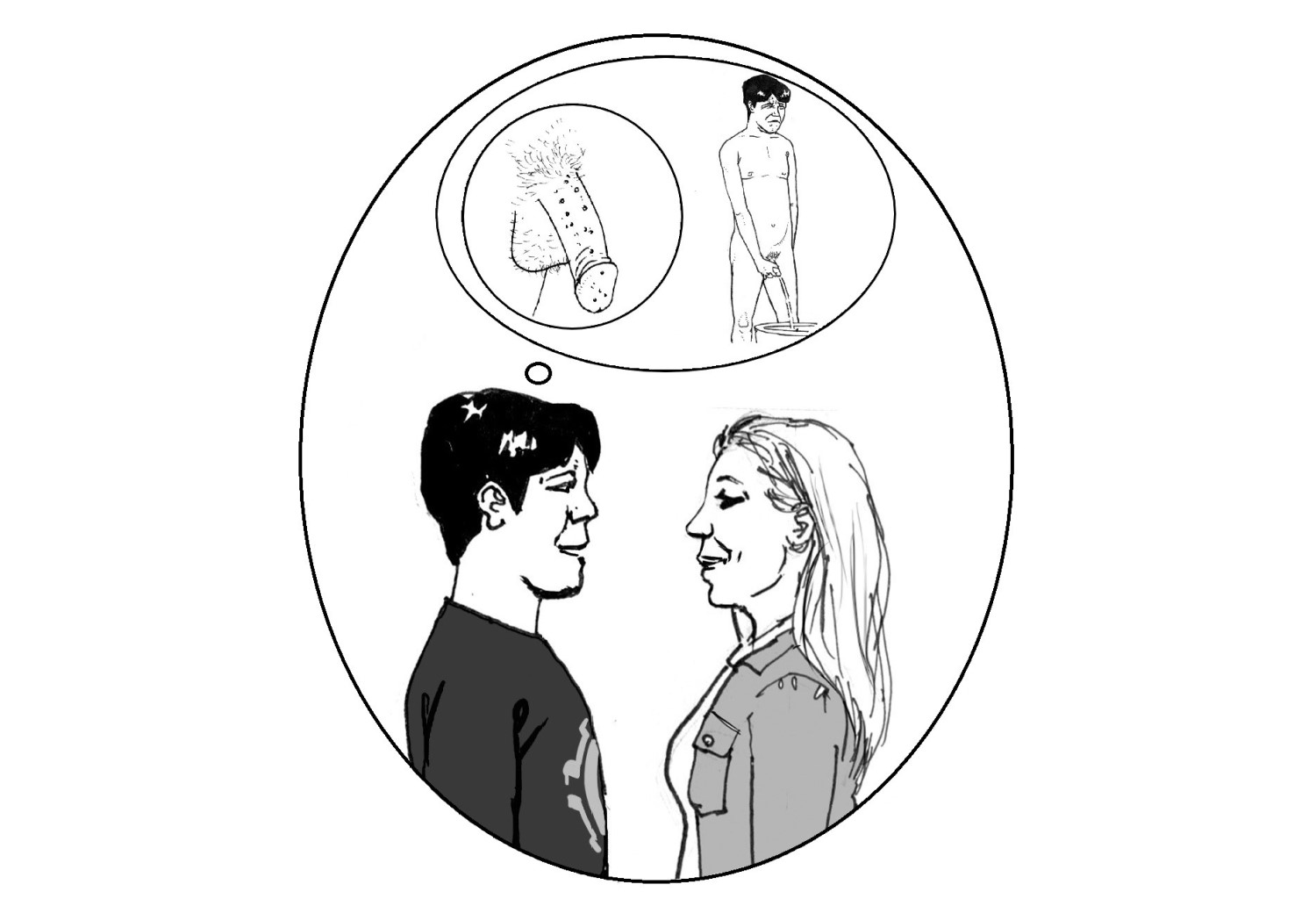 На илустрацијата посочете го балончето во кое се собира спермата. Наведете дека на овој начин спермата останува во кондомот, не влегува во девојката.