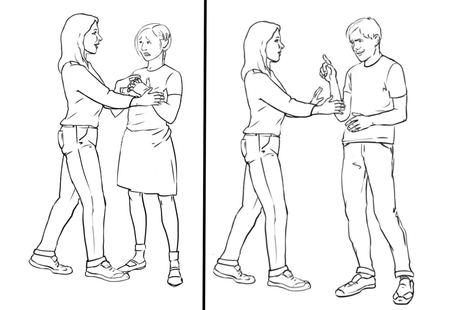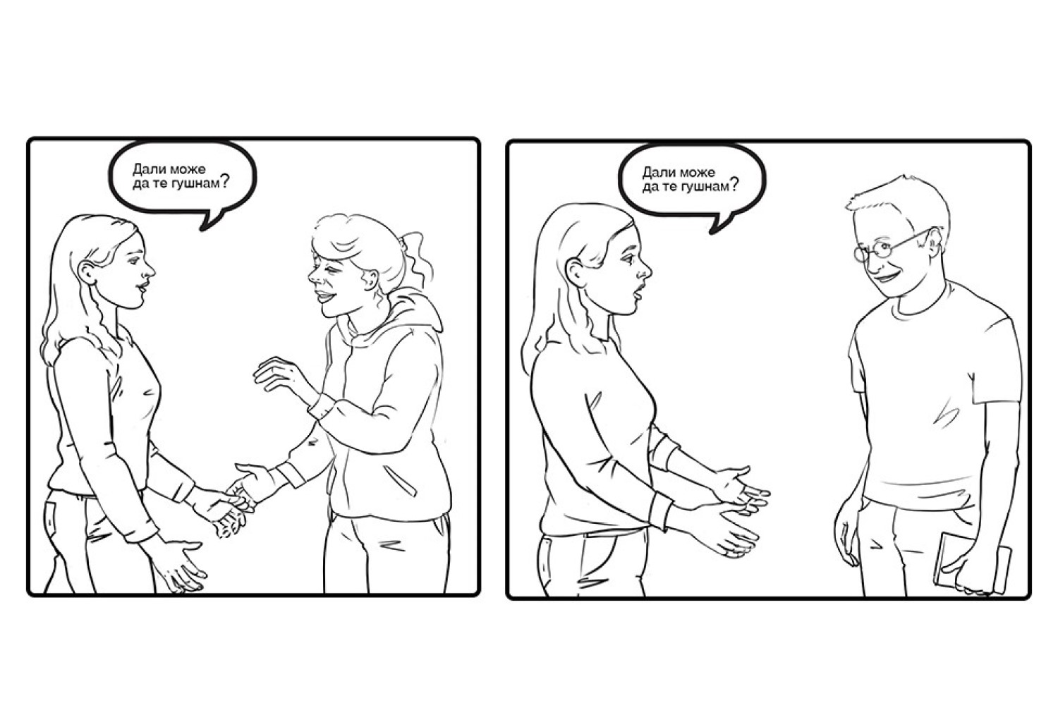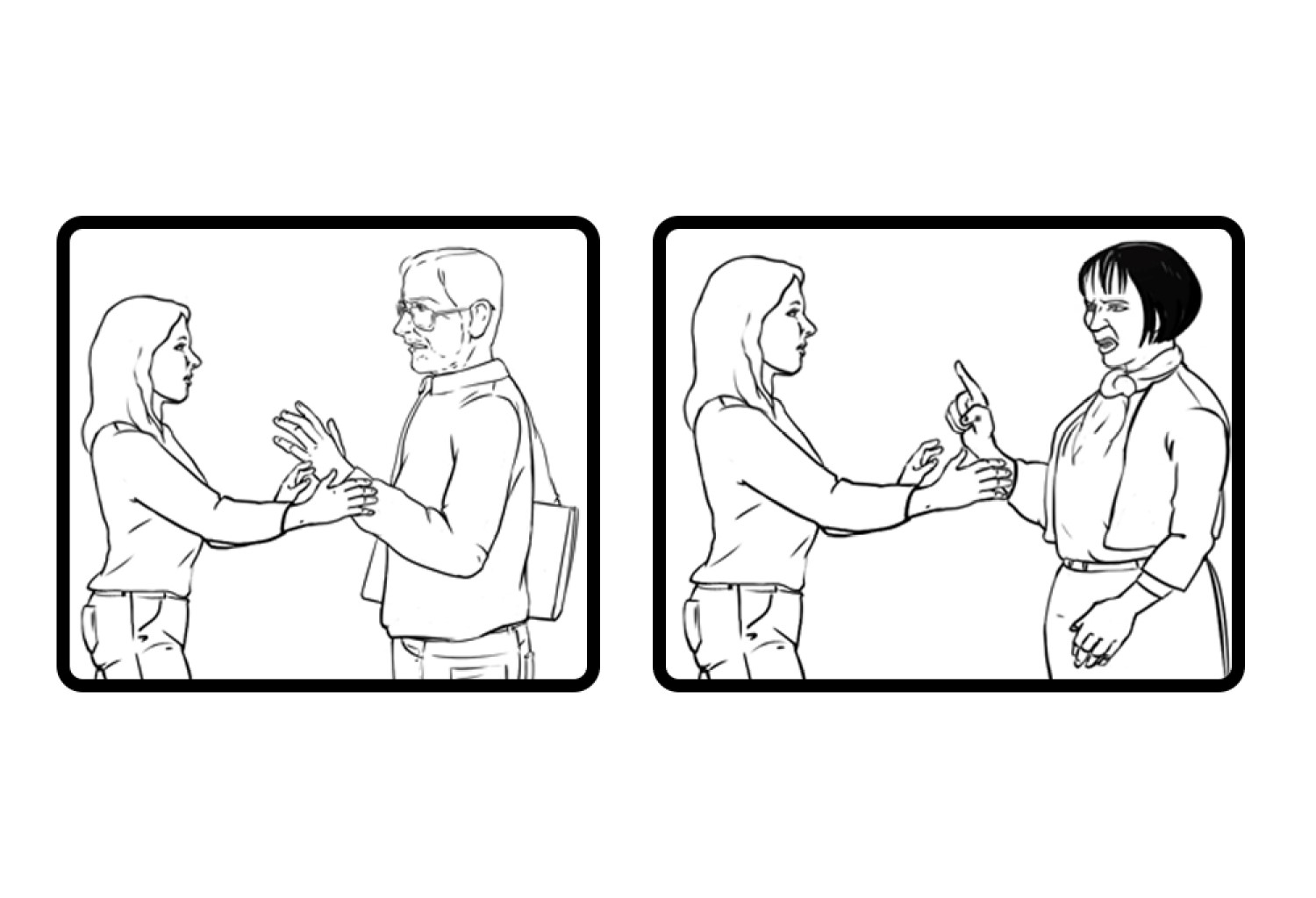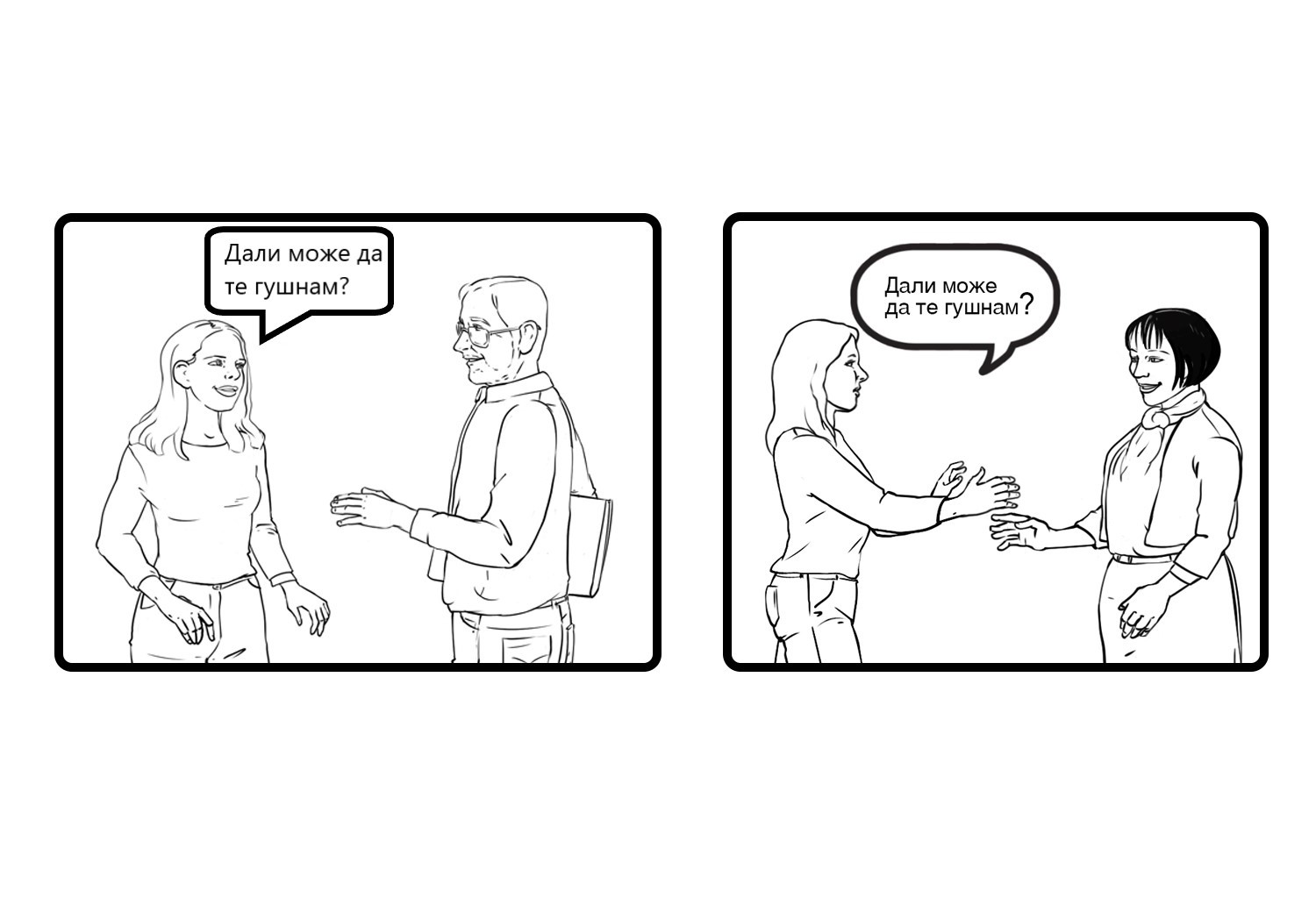 Набројте ги наставниците и наставничките кои Вашата ќерка/ученичка/роднина/корисничка ги има, доколку оди во училиште. Доколку посетува дневен центар наведете ги професионалците од центарот. Доколку Вашата ќерка/ученичка/роднина/корисничка е варботена терминот наставници и наставнички заменете го со колеги и колешки од работа. Нагласете дека е во ред да се праша за дозвола, пред да се гушне некој, бидејќи само така Вашата ќерка/ученичка/роднина/корисничка може да знае дали може да допре некој или не. Оваа ситуација можете да ја вежбате со Вашата ќерка/ученичка/роднина/корисничка преку игра на улоги, каде практично ќе ја претставите ситуацијата и прашањето кое треба да се постави.