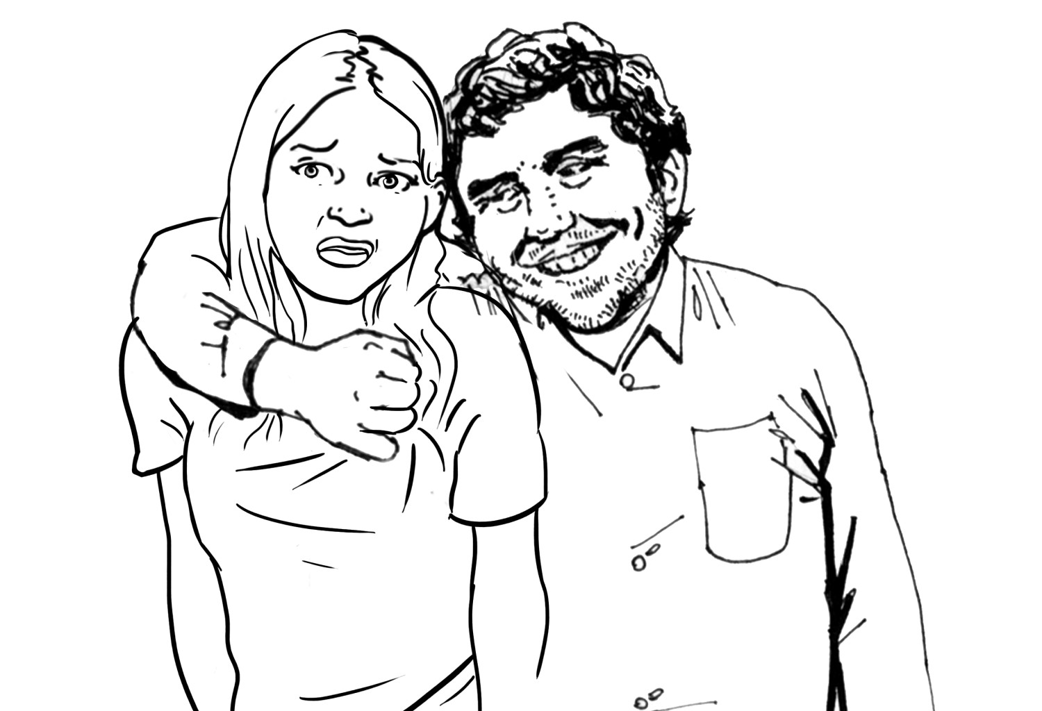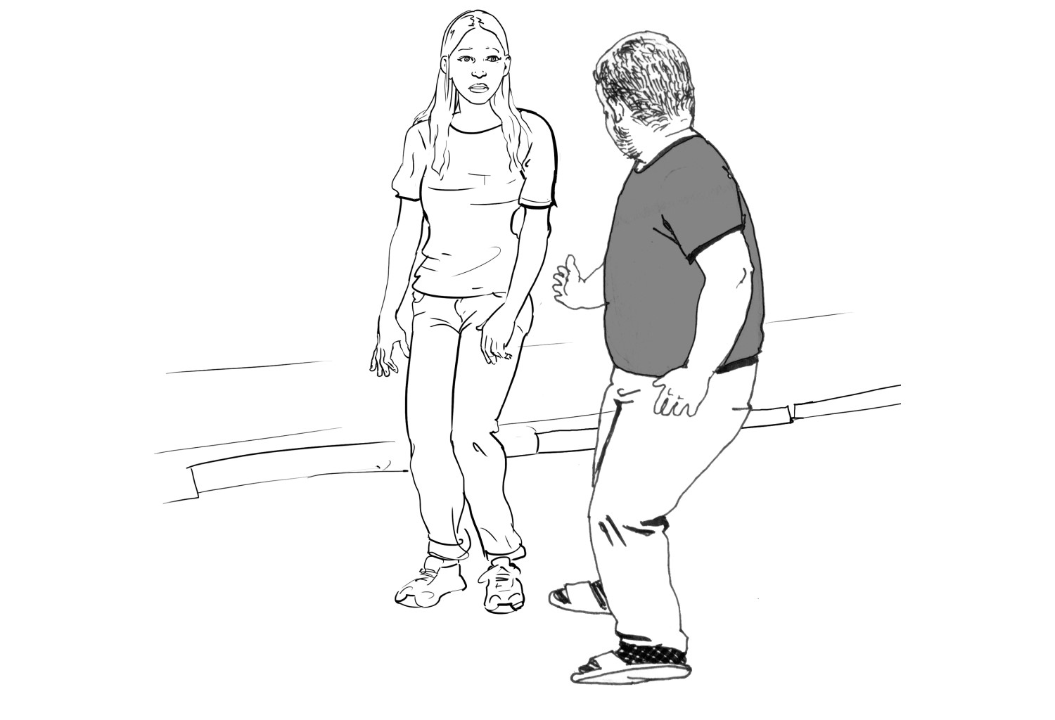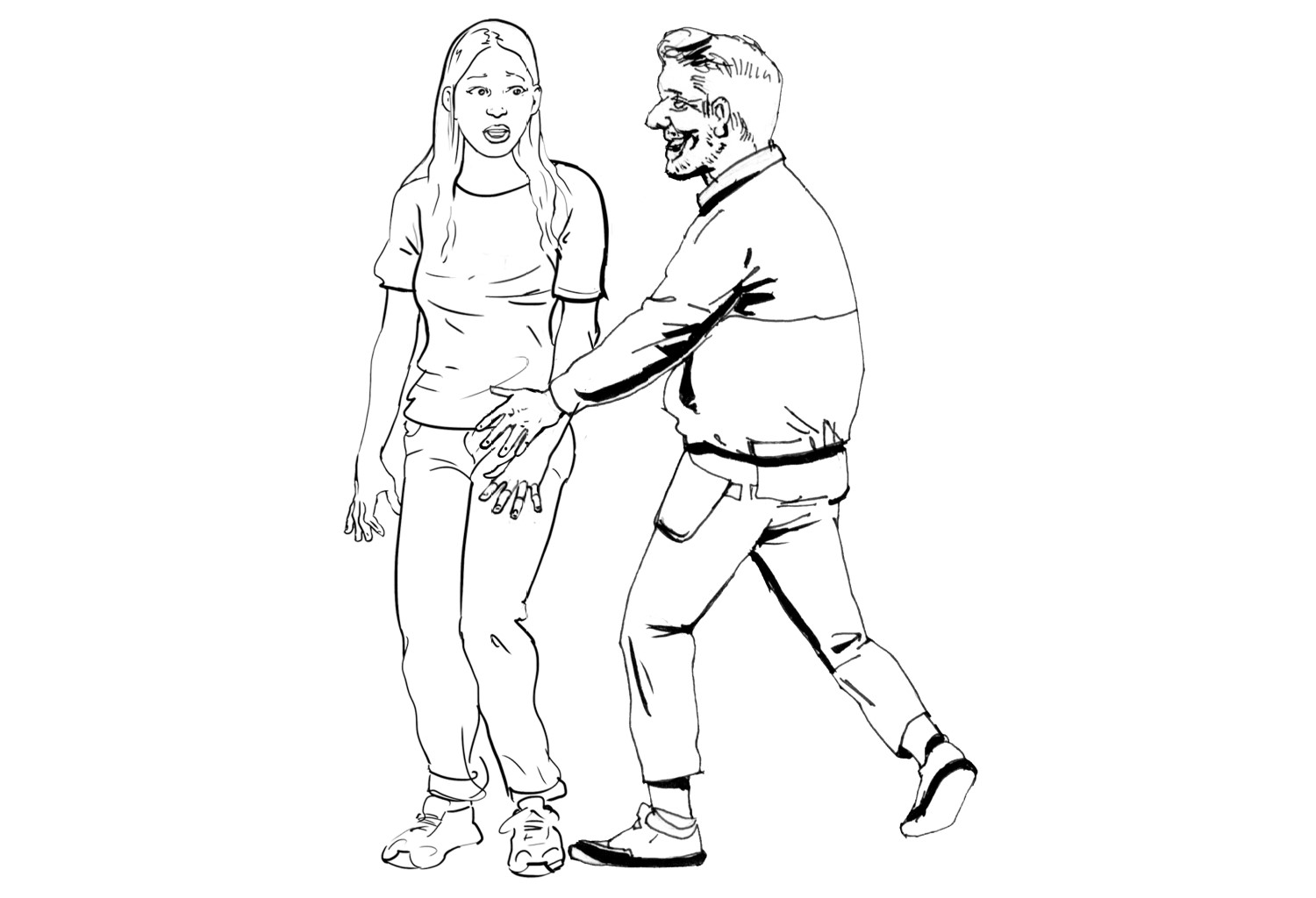 Опишете ја лицевата експресија (збунета, изненадена, лута и сл.) и поставеноста на телото (згрчена, се обидува да се одбрани и сл.) и нагласете дека токму од лицето и телото се гледа дали на девојката и е пријатно или непријатно.