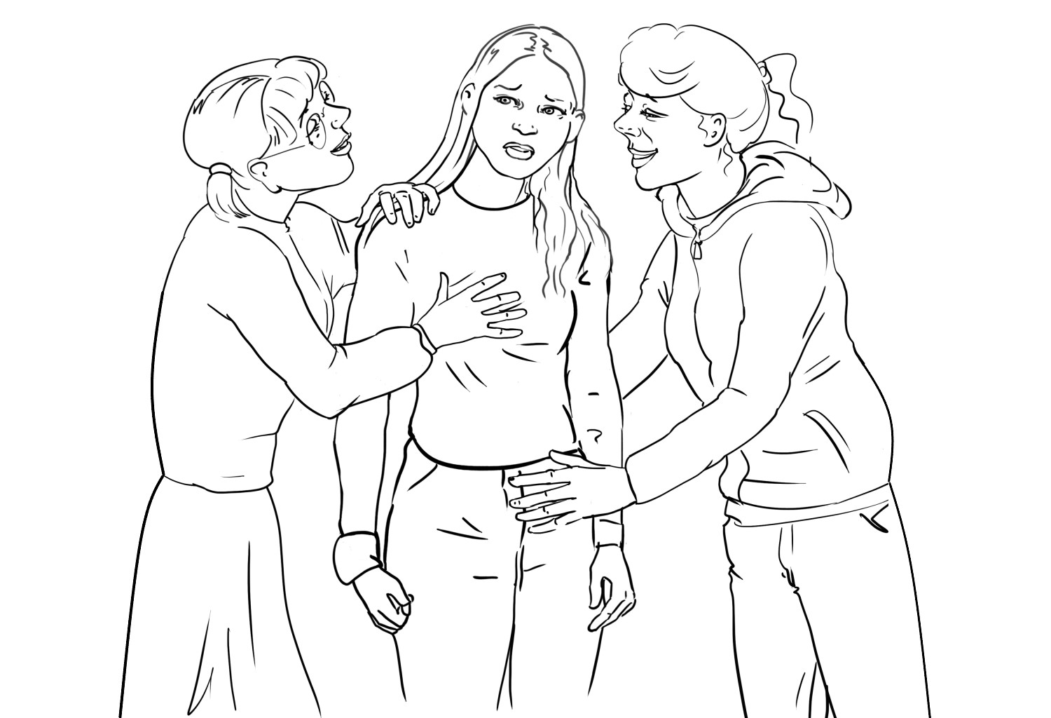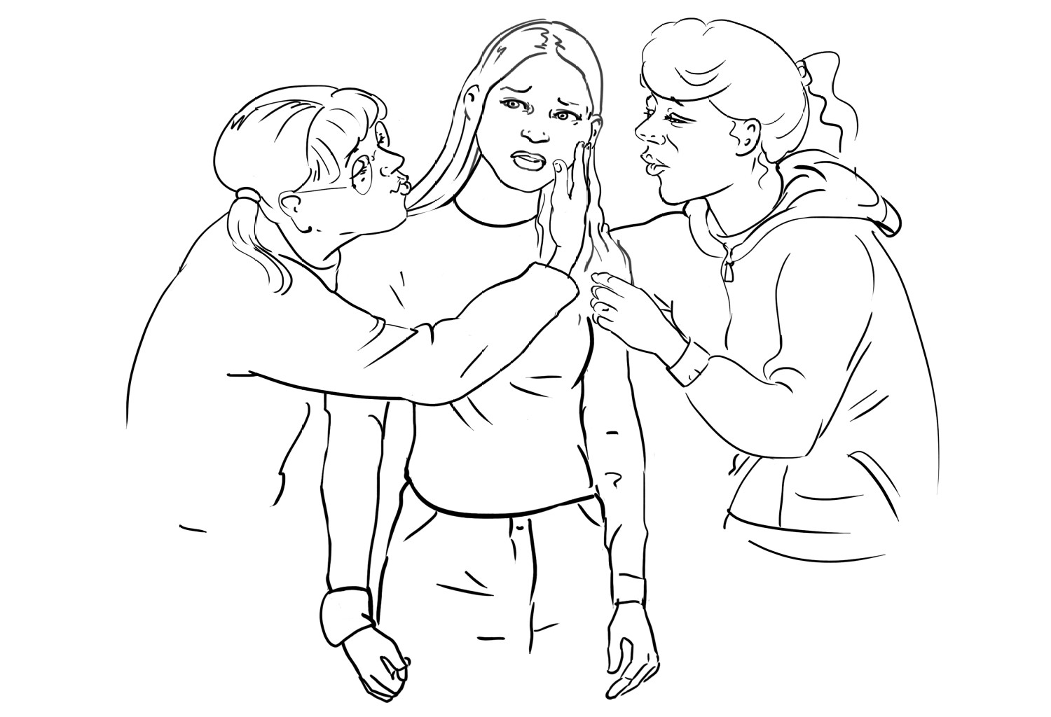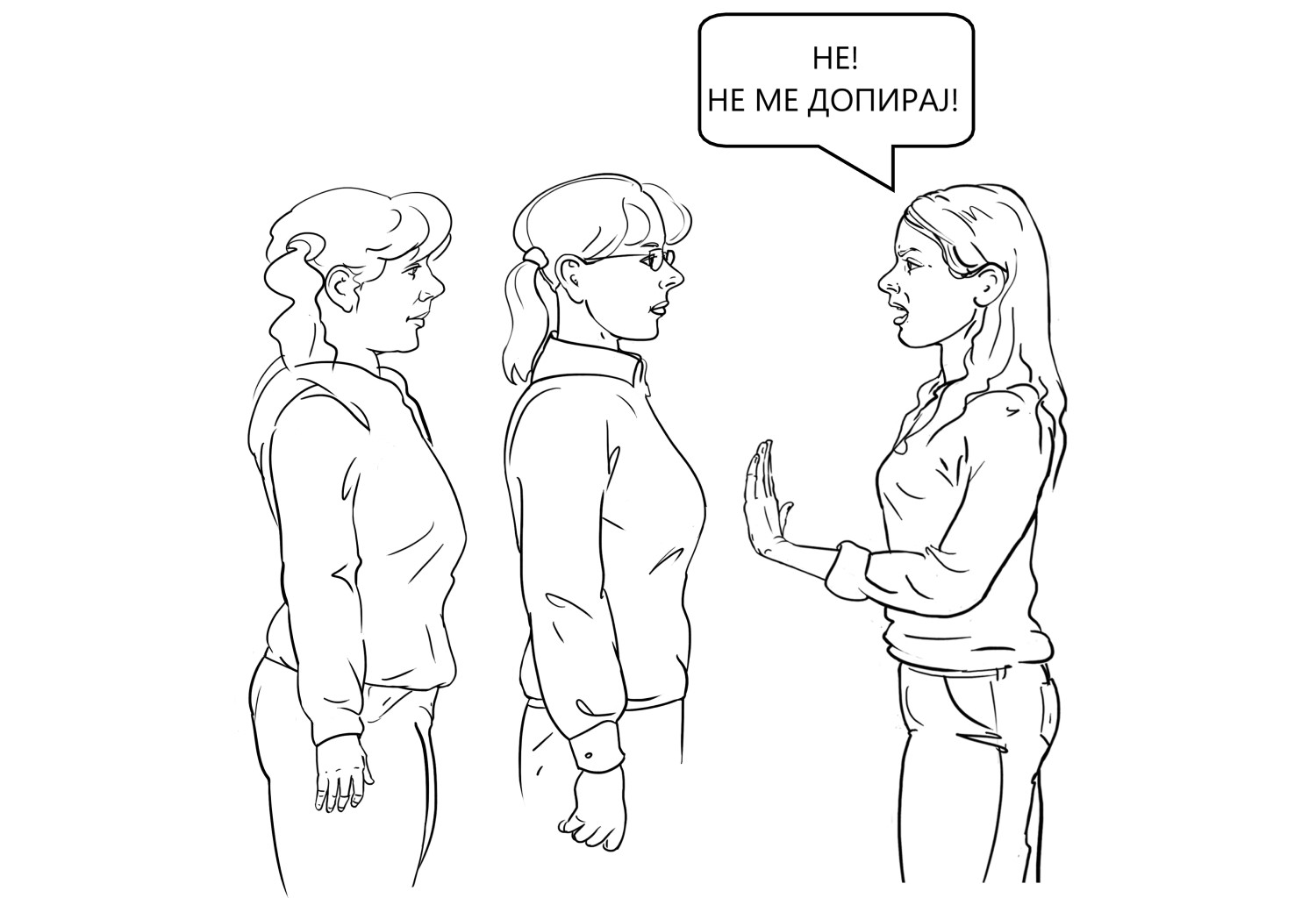 Опишете ја лицевата експресија (збунета, изненадена, лута и сл.) и поставеноста на телото (згрчена, се обидува да се одбрани и сл.) и нагласете дека токму од лицето и телото се гледа дали на девојката и е пријатно или непријатно.