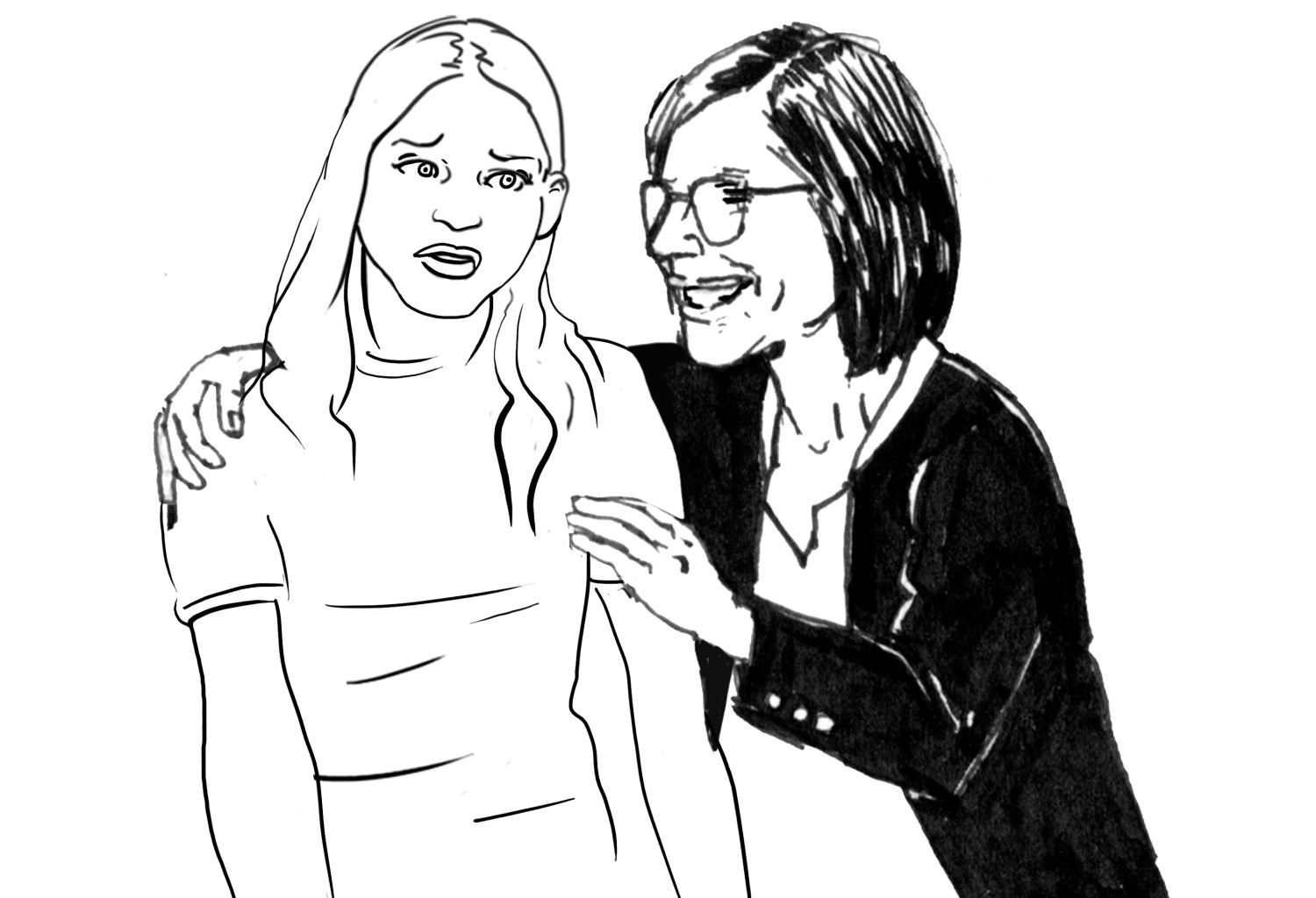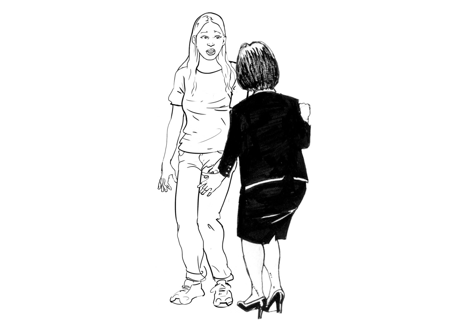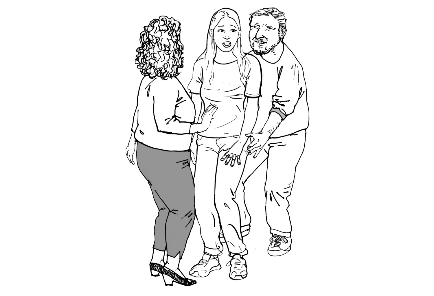 Опишете ја лицевата експресија (збунета, изненадена, лута и сл.) и поставеноста на телото (згрчена, се обидува да се одбрани и сл.) и нагласете дека токму од лицето и телото се гледа дали на девојката и е пријатно или непријатно.