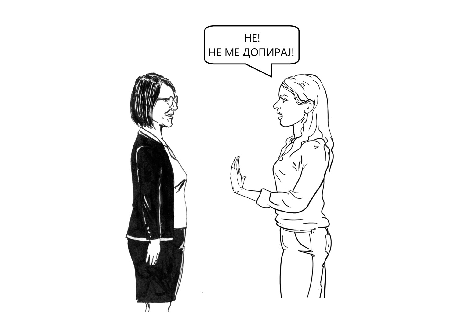 Од особено значење е Вашата ќерка/ученичка/роднина/корисничка да знае дека непријатни допири може да искуси од сите блиски луѓе, меѓу кои и Вашите пријатели. Затоа е важно да се претстави оваа можна ситуација, за да истата биде препознаена доколку се случи. Ликовите на илустрацијата именувајте ги согласно Вашите пријатели, кои се присутни во опкружување на Вашата ќерка/ученичка/роднина/корисничка.